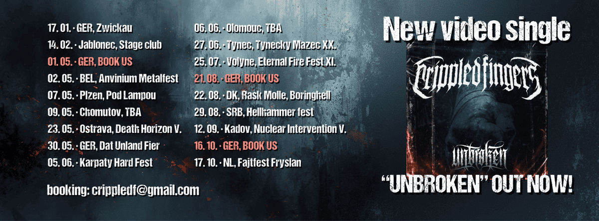 Μετά το τρίτο τους άλμπουμ Through the Pain και την κυκλοφορία του πλήρους live set τους από το Fajtfest Fryslân, οι Τσέχοι Crippled Fingers περνούν στο επόμενο κεφάλαιο, με ένα νέο άλμπουμ στον ορίζοντα. Το νέο τους single, «Unbroken», κυκλοφορεί τώρα!