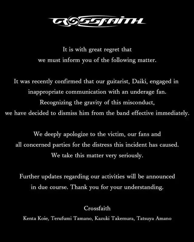 “Πρόσφατα επιβεβαιώθηκε ότι ο κιθαρίστας μας, Daiki, είχε ανάρμοστη επικοινωνία με ανήλικη θαυμάστρια. Αναγνωρίζοντας τη σοβαρότητα της πράξης αυτής, αποφασίσαμε να τον απομακρύνουμε άμεσα από τη μπάντα.”