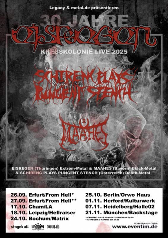 Im Sommer letzten Jahres veröffentlichten die thüringischen Meister des Makabren, EISREGEN, ihr aktuelles Studioalbum “Abart” (über Massacre Records HIER erhältlich). Heute gab die Band im Rahmen ihres 30.jährigen Bandjubiläums Tour-Termine für den Herbst 2025 bekannt, sowie für den 26. September 2025 eine Neu-Veröffentlichung ihres bahnbrechenden, zweiten Studioalbums aus 1998, “Krebskolonie”!