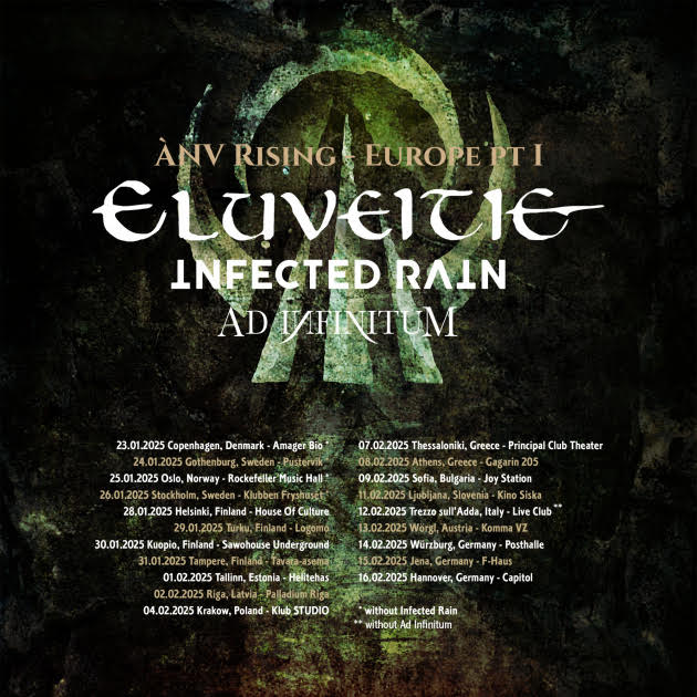 Μετά την κυκλοφορία του πολυβραβευμένου έκτου στούντιο των INFECTED RAIN “TIME” (κυκλοφόρησε τον Φεβρουάριο του 2024 μέσω της Napalm Records ΕΔΩ), και ενώ ετοιμάζονται για ένα τρέχον, πολυάσχολο πρόγραμμα καλοκαιρινών περιοδειών, το σύγχρονο progressive metal συγκρότημα της Μολδαβίας ανακοίνωσε μια ευρωπαϊκή περιοδεία ως special guests των ELUVEITIE, ξεκινώντας στις αρχές του 2025!