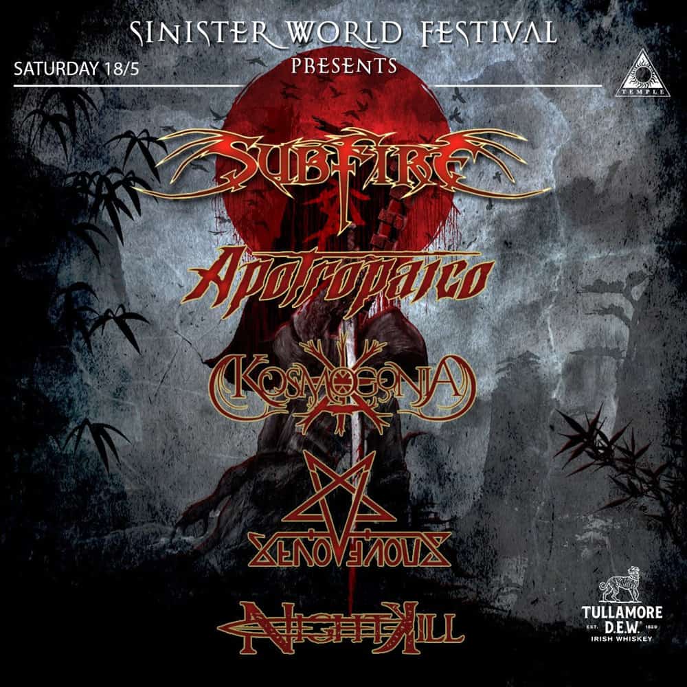 Οι Subfire με περίσσια υπερηφάνια ανακοινώνουν την έναρξη του δικού τους φεστιβάλ, του Sinister World Festival, το οποίο θα πραγματοποιηθεί στο Temple Club, στην Αθήνα, το Σάββατο 18 Μαΐου 2024 παρουσιάζοντας ζωντανά το νέο άλμπουμ. Στις μπάντες θα συμμετέχουν οι Ισπανοί thrash/heavy metallers Apotropaico ως special guests, οι folk metallers Kosmogonia, οι heavy/speed metallers XenoVenous & οι melodic heavy metallers Nightkill.