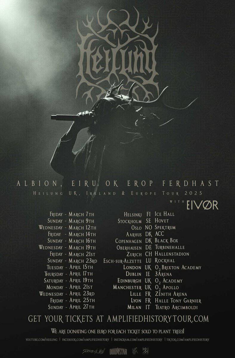 Σε ένα από τα τελευταία τους καλέσματα πριν από έναν επ’ αόριστον ύπνο, οι HEILUNG, συνοδευόμενοι από την αιθέρια μάγισσα των Νήσων Φερόε, Eivør, θα ξυπνήσουν τα προγονικά πνεύματα σε 15 μοναδικές ημερομηνίες σε όλο το Ηνωμένο Βασίλειο, την Ιρλανδία και την Ευρώπη.