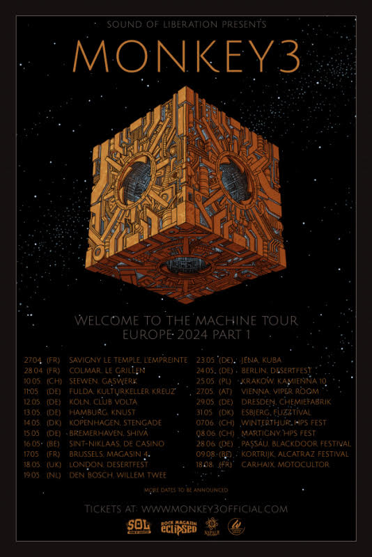 Για την υποστήριξη του “Welcome To The Machine”, οι MONKEY3 έχουν ανακοινώσει ένα εκτεταμένο πρόγραμμα ευρωπαϊκών περιοδειών, συμπεριλαμβανομένων εμφανίσεων σε φεστιβάλ στο Desertfest Berlin & London.