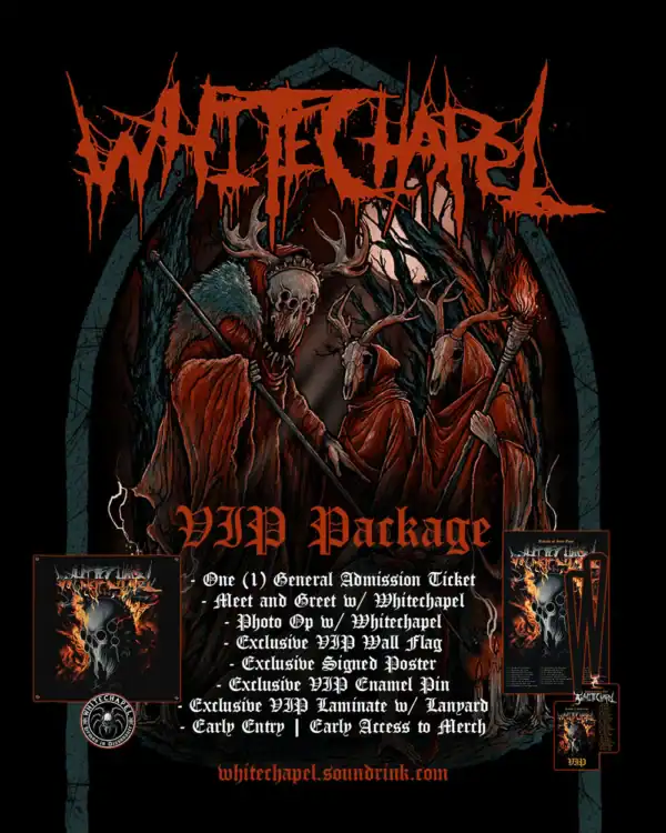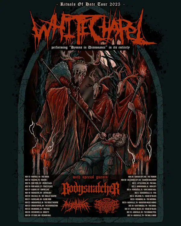 Οι WHITECHAPEL επιστρέφουν στις σκηνές των Ηνωμένων Πολιτειών αυτό το φθινόπωρο με την περιοδεία Rituals Of Hate ως headliners. Η περιοδεία θα περάσει από περισσότερες από είκοσι πόλεις, από τις 12 Νοεμβρίου έως τις 14 Δεκεμβρίου, με το συγκρότημα να παρουσιάζει ζωντανά, ολόκληρο το νέο τους full-length άλμπουμ “Hymns In Dissonance”, μαζί με μερικά από τα παλαιότερα αγαπημένα κομμάτια τους. Τη συναυλία θα πλαισιώσουν οι BODYSNATCHER, ANGELMAKER και DISEMBODIED TYRANT.