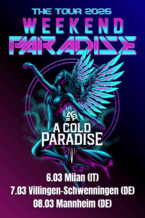 Επιπλέον, οι A COLD PARADISE θα παρουσιάσουν για πρώτη φορά το νέο τους υλικό στη σκηνή κατά τη διάρκεια της περιοδείας τους «Weekend Paradise» τον Μάρτιο του 2026. Η μπάντα θα εμφανιστεί στο Μιλάνο της Ιταλίας, καθώς και στο Villingen-Schwenningen και στο Mannheim της Γερμανίας, στις 6, 7 και 8 Μαρτίου, παρουσιάζοντας την εξελισσόμενη καλλιτεχνική τους ταυτότητα και προσφέροντας στο κοινό μια αποκλειστική ματιά στο επερχόμενο άλμπουμ. Η πώληση των εισιτηρίων ξεκινά στις 15 Δεκεμβρίου στο www.ursulaz.com/weekendparadise. Αυτή θα είναι η πρώτη ευκαιρία να ζήσετε τους A COLD PARADISE ζωντανά – ένα event που δεν πρέπει να χάσετε.