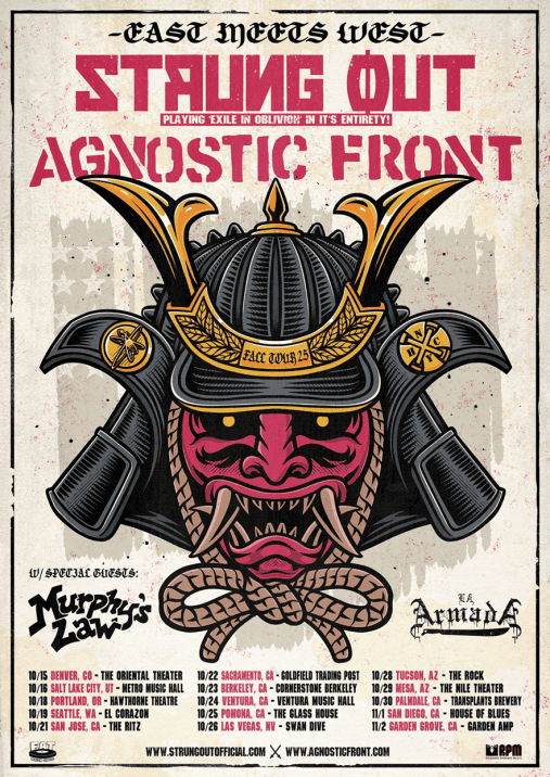 Οι AGNOSTIC FRONT πρόκειται να κάνουν περιοδεία στη δυτική ακτή των Ηνωμένων Πολιτειών αυτό το φθινόπωρο με συμμετοχές από τις μπάντες STRUNG OUT (που θα παίζουν ολόκληρο το άλμπουμ “Exile In Oblivion”), MURPHY’S LAW και LA ARMADA.