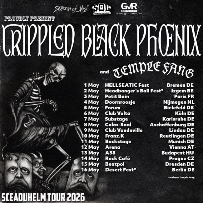 Οι CRIPPLED BLACK PHOENIX ετοιμάζονται να ξεκινήσουν το Sceaduhelm Tour 2026, μεταφέροντας τα σαρωτικά, μελαγχολικά ηχοτοπία του καταλόγου τους σε χώρους συναυλιών σε όλη την Ευρώπη. Αυτή η νέα περιοδεία αντιπροσωπεύει μια δέσμευση στο ζωντανό θέατρο ως αναπόσπαστο στοιχείο της ταυτότητας του συγκροτήματος — μια δέσμευση που γεννήθηκε μέσα από χρόνια εξελισσόμενης απόδοσης και ατμοσφαιρικής έντασης.