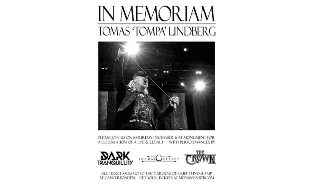 Τώρα, δύο μήνες αργότερα, οι DARK TRANQUILLITY, THE CROWN και THE HALO EFFECT συγκεντρώνονται και διοργανώνουν μια φιλανθρωπική συναυλία που όχι μόνο τιμά τον αείμνηστο Lindberg, αλλά σκοπό έχει να συγκεντρωθούν και χρήματα για φιλανθρωπικούς σκοπούς. Τα έσοδα από την εκδήλωση (εισιτήρια εδώ!), που θα πραγματοποιηθεί στις 6 Δεκεμβρίου στο Monument 031 στο Γκέτεμποργκ της Σουηδίας, θα διατεθούν στο Cancerfonden (Το Σουηδικό Ίδρυμα για τον Καρκίνο) και στο ταμείο Gardens of Grief που ίδρυσε ο Elis Markskog των Malmö Massacre.