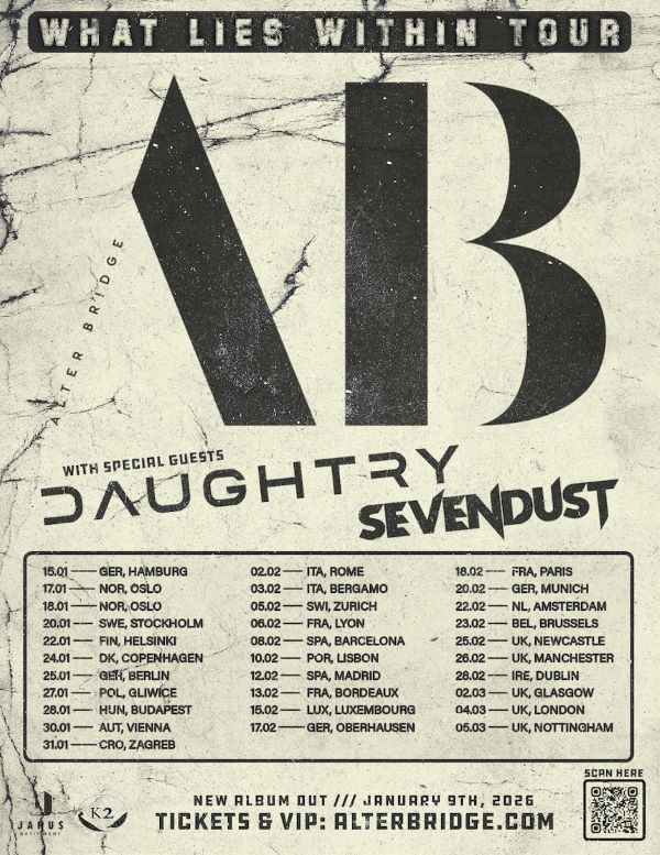To coincide with the announcement of the new album, ALTER BRIDGE will be touring in support of the release. The band is heading out on the What Lies Within Tour. The 31-date tour of Europe will kick off on January 15th in Germany before it wraps on March 5th in Nottingham, UK. Joining the band on the tour will be Daughtry and Sevendust. Public on sale for all shows is July 18th. More information on all tickets and VIP packages for the upcoming tour can be found at www.alterbridge.com.