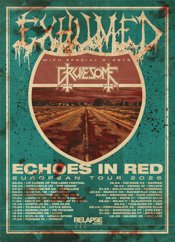 Additionally, EXHUMED take “Red Asphalt” on the road throughout 2026 starting with the US from February 19 – March 21 with Oxygen Destroyer & No/Más! After a quick pit stop, EXHUMED returns to Europe/UK this Spring with labelmates GRUESOME from April 4 – May 2. Tickets are on sale now & all confirmed EU dates are available below. More tour dates to be announced soon!
