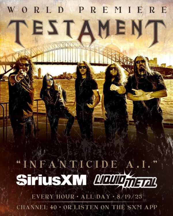 Be the first to hear TESTAMENT’s new song “Infanticide A.I.” exclusively on SiriusXM Liquid Metal with Jose Mangin today, Tuesday, August 19th!