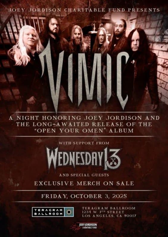The reunion show will take place at Teragram Ballroom, the Joey Jordison Charitable Fund will not only honor Jordison’s memory but also celebrate the release of the album. VIMIC will be supported by Wednesday 13 (who worked with Jordison in MURDERDOLLS) along with some very special guests such as Luanna Demetto (CRYPTA), Ash Pearson (3 INCHES OF BLOOD, REVOCATION, ZIMMERS HOLE), Chris Williams (ACCEPT), Caleb Hayes (prodigy child drummer), and more to be announced; there will be exclusive event merchandise available.