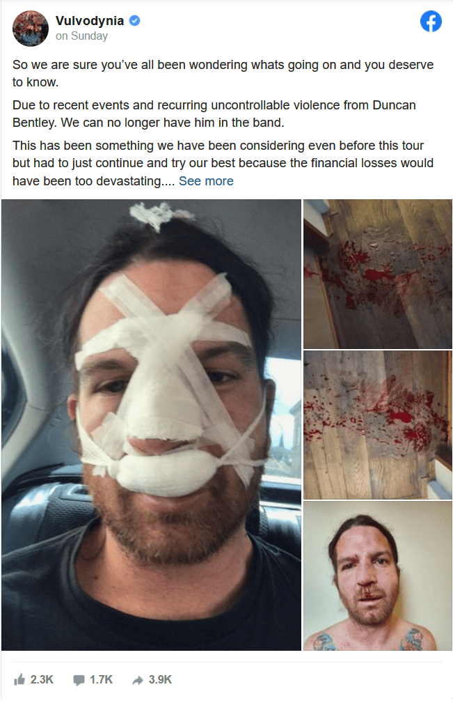 He threatened and tried to kill our drummer Tom. Tom ended up in hospital and suffered various injuries, including a badly broken nose. It’s also not the first time he’s attacked Tom and displayed this kind of violence. It’s been a recurring problem for a while. We thought it was alcohol related, but now we know who it is.