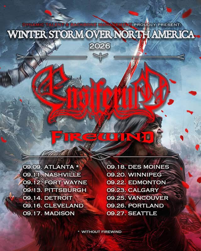 Οι φινλανδοί γίγαντες του folk metal ENSIFERUM επιστρέφουν σε σκηνές των ΗΠΑ και του Καναδά με μια περιοδεία ως headliners. Η περιοδεία με τίτλο «Winter Storm Over North America» ξεκινά με την εμφάνισή τους στο φετινό ProgPower USA στην Ατλάντα της Τζόρτζια και ολοκληρώνεται στις 27 Σεπτεμβρίου στο Σιάτλ της Ουάσινγκτον. Μαζί τους ως support θα εμφανιστούν οι FIREWIND.