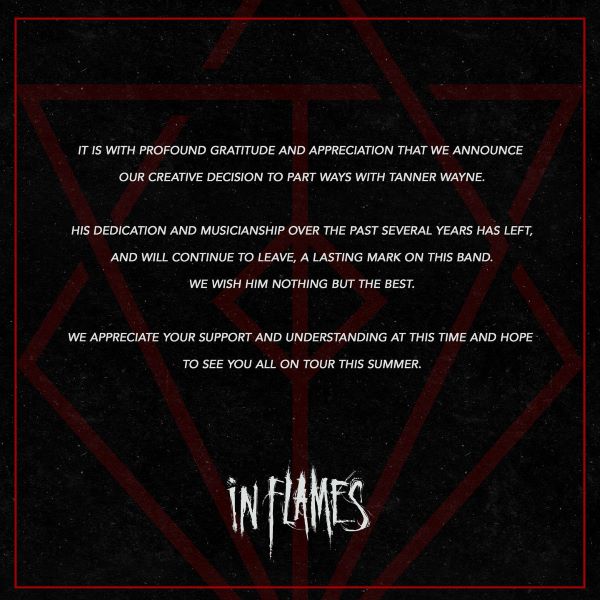 Οι IN FLAMES ανακοίνωσαν πως χωρίζουν τους δρόμους τους με τον ντράμερ Tanner Wayne. Η απόφαση του συγκροτήματος έρχεται λίγο πριν την έναρξη της ευρωπαϊκής περιοδείας τους στις 2 Ιουνίου.