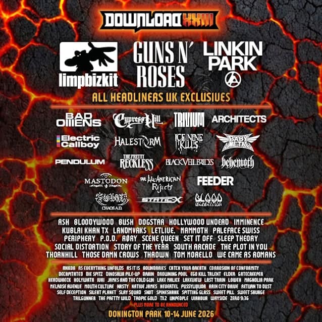Το 2026, το Download XXIII θα φιλοξενήσει ένα τρίο θρυλικών headliners: τους nu-metal icons LIMP BIZKIT — που θα είναι για πρώτη φορά στην κορυφή του φεστιβάλ στα 31 χρόνια καριέρας την Παρασκευή, τους hard rock θρύλους GUNS N’ ROSES το Σάββατο και τους μοναδικούςLINKIN PARK που θα εμφανιστούν στο Download για πρώτη φορά από την επανένωση της μπάντας το 2024 με την τραγουδίστρια Emily Armstrong. Ωστόσο, έχουν εμφανιστεί ως headliners στο Download Festival 4 φορές με την αρχική τους σύνθεση μεταξύ 2004 και 2014.