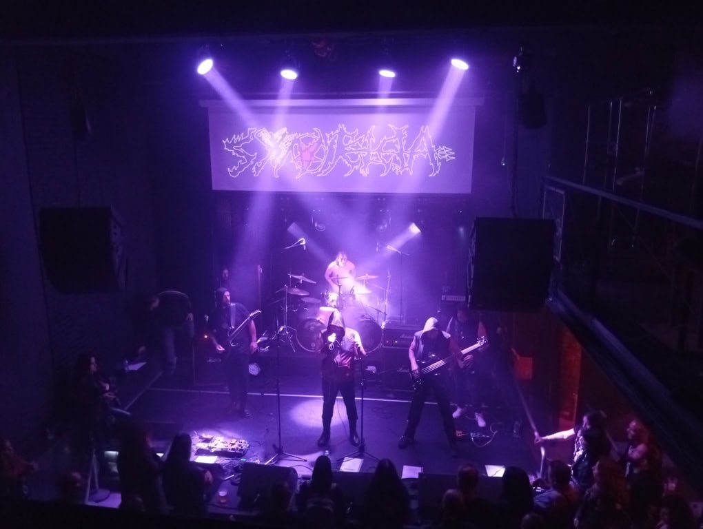 Λίγο μετά τις 21:45 οι ELDINGAR αποχώρησαν για να μας δώσουν την ευκαιρία να πάρουμε μια ανάσα και να επιδοθούμε στην αγαπημένη ενασχόληση των μεταλλάδων…το socializing στο περιθώριο των live. Όλα αυτά όμως για κανένα εικοσάλεπτο αφού γρήγορα επιστρέψαμε στις θέσεις μας για τους Αθηναίους SYNTELEIA. Παραμείναμε βεβαίως στο Black Metal ύφος αλλά περάσαμε σε πιο αποκρυφιστικές καταστάσεις. Δεν ξέρω πως αποφασίστηκε η σειρά εμφάνισης των συγκροτημάτων αλλά θεωρώ ότι το δίδυμο SYNTELEIA – EXILIUM NOCTIS έδεσε ιδανικά. Μουσικά θα λέγαμε ότι επιστρέψαμε σε πιο κλασικά μονοπάτια που έριξαν ένα μαύρο πέπλο πάνω από το Temple. Αυτό το σκοτάδι φωτίστηκε προς στιγμήν από τη συμμετοχή της σοπράνο Μίνας Μόρφης, η οποία όπως ανακοίνωσε o Nyctelios, πλέον αποτελεί κανονικό μέλος της μπάντας. Παρόλα αυτά η αναμφισβήτητα υπέροχη φωνή της δεν μπόρεσε να ξεδιπλωθεί σε όλο της το μεγαλείο αφού κάπου χανόταν ενώ γενικότερα οι SYNTELEIA αντιμετώπισαν και κάποια τεχνικά προβλήματα. Αυτό βέβαια δεν πτόησε κανέναν αφού τελικά είδαμε και το πρώτο mosh pit της βραδιάς και γενικότερα το κοινό ήταν έτοιμο να βουτήξει στα βάθη της κολάσεως.