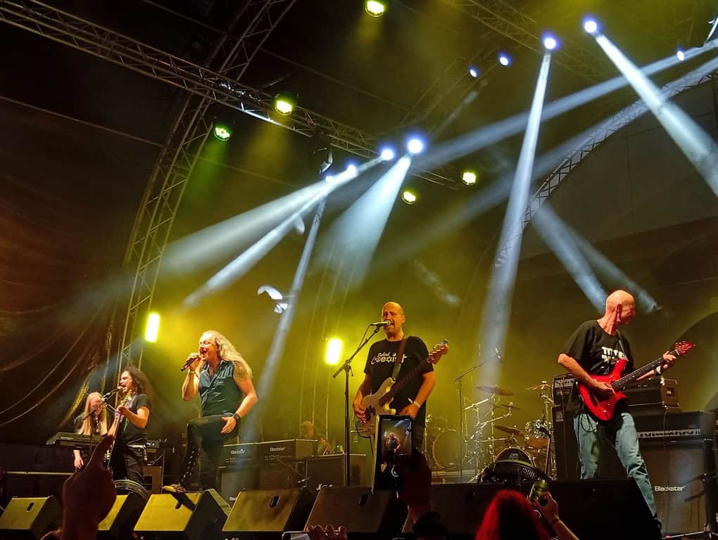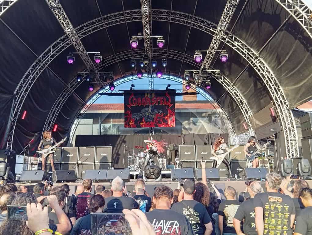 Στα της μουσικής τώρα…η πρώτη μπάντα που είδα ήταν οι COBRA SPELL, η σχεδόν all female μπάντα (με την εξαίρεση του κιθαρίστα Adri Funeirailles) της Sonia Anubis με το αρκετά μοντέρνο αλλά με vintage πινελιές Heavy Metal τους και την προσεγμένη σκηνική παρουσία που παρά τη δύσκολη ώρα με τον ήλιο στα μούτρα τους, τα έδωσαν όλα και κέρδισαν το χειροκρότημα του κοινού. Σε αυτό το σημείο να πούμε ότι στα θετικά της ημέρας αλλά και συνολικά του φεστιβάλ ήταν ότι ο κόσμος ήταν αρκετός από πολύ νωρίς αφού βοήθησε σε αυτό τόσο ο καιρός όσο και η τοποθεσία που είναι πολύ άνετη για τους παρευρισκόμενους με αρκετά σημεία με σκιά για εμάς του γηραιότερους.
