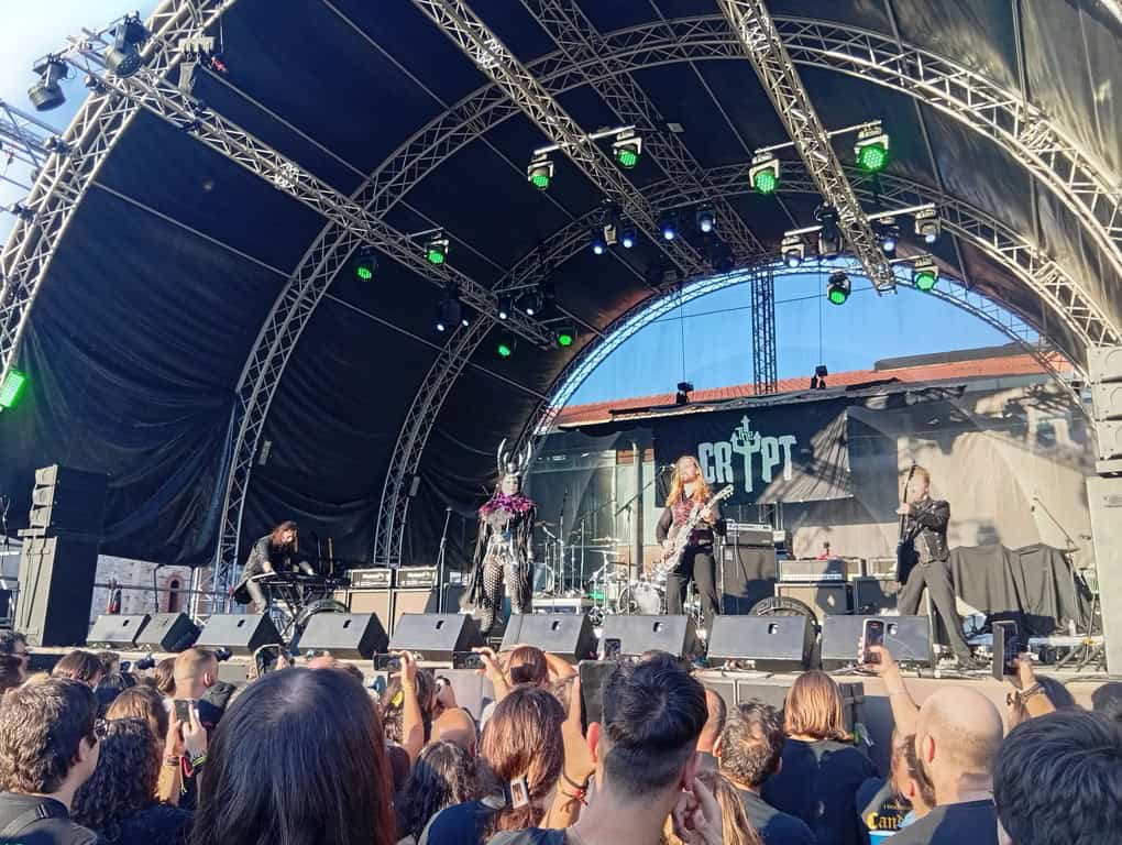 Η συνέχεια επεφύλασσε ακόμα ένα μικρό highlight κατά τη γνώμη μου. Οι Σουηδοί Heavy / Doom Metallers THE CRYPT ανέβηκαν στη σκηνή και τα βλέμματα έπεσαν κατευθείαν στη φοβερή και τρομερή Pepper με την εντυπωσιακή περιβολή της που όσο περνούσε η ώρα αφαιρούσε κομμάτια της. Ιδανικά, θα ήθελα να τους απολαύσω σε κλειστό χώρο με ελάχιστο φωτισμό αλλά και κάτω από τον δυνατό Αθηναϊκό ήλιο μια χαρά δημιούργησαν τη σκοτεινή ατμόσφαιρα που λογικά είναι και το σήμα κατατεθέν τους. Πιασάρικα τραγούδια, θεατρικότητα σε ερμηνεία και σκηνική παρουσία και γενικότερα μια μπάντα που φάνηκε γρήγορα τί θέλει να υπηρετήσει και πως έχει τον τρόπο να το κάνει με επιτυχία.