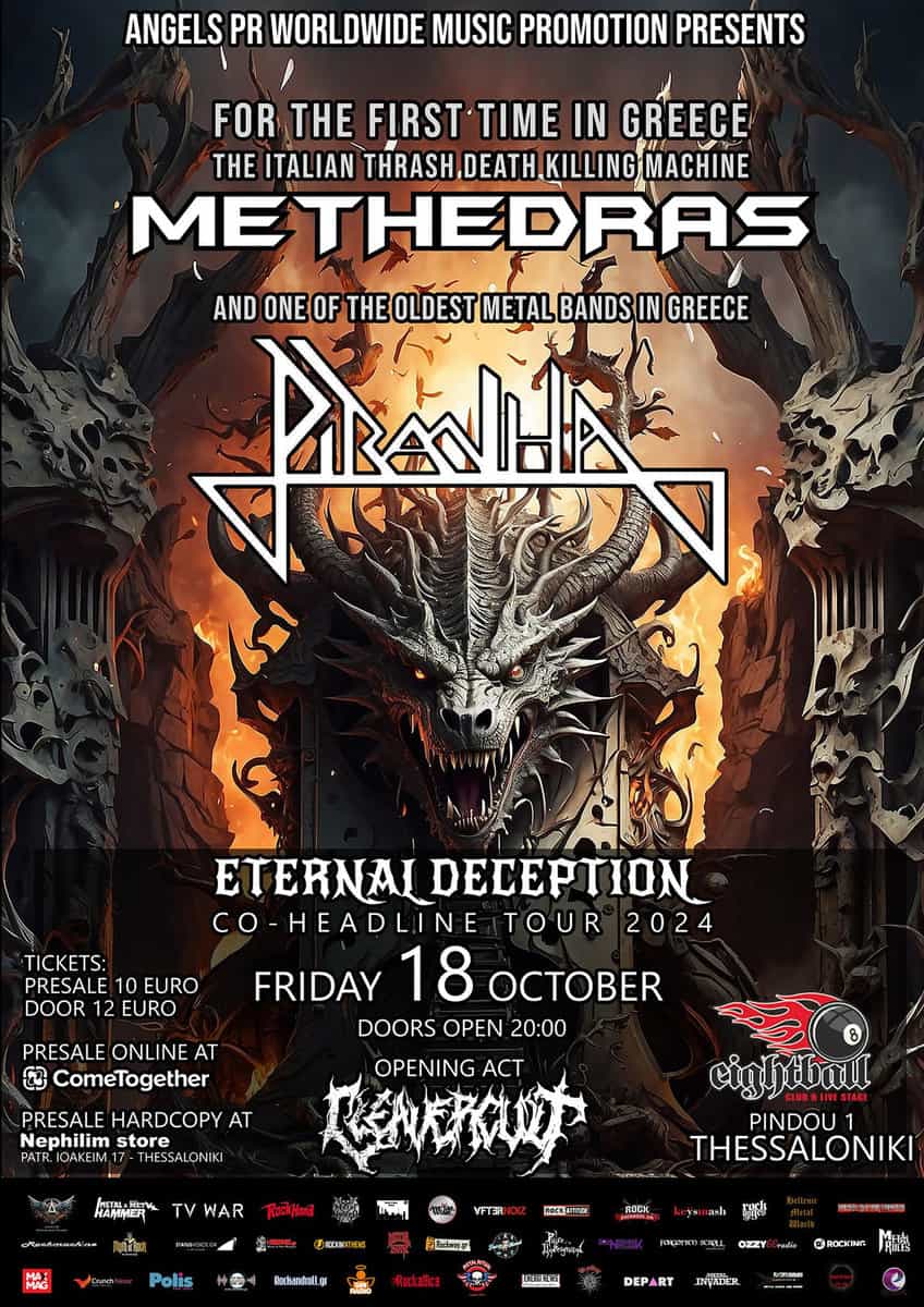 Για πρώτη φορά έρχεται στην Ελλάδα η Thrash – Metal δολοφονική μηχανή των METHEDRAS και συναντάει μια από τις ιστορικότερες Ελληνικές metal μπάντες, τους PIRANHA για τέσσερα εκρηκτικά live shows στα πλαίσια του “ETERNAL DECEPTION” tour 2024.