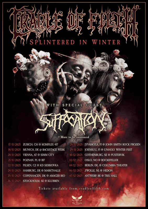 «Μετά την επιτυχημένη περιοδεία μας “Summoned In Summer”, οι CRADLE OF FILTH επιστρέφουν στην Ευρώπη με τους Suffocation ως special guests αυτόν τον Νοέμβριο, με δύο ακόμη συγκροτήματα να ανακοινώνονται σύντομα.