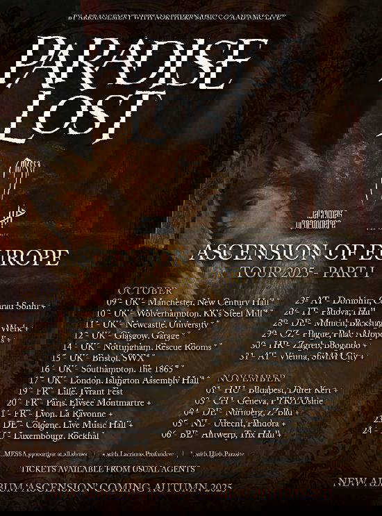 Οι PARADISE LOST, ανακοίνωσαν πρόσφατα τις ημερομηνίες για το πρώτο σκέλος της περιοδείας τους Ascension Of Europe Tour 2025. Η ιταλική μπάντα MESSA θα είναι το άμεσο support σε όλες τις ημερομηνίες, με τους HIGH PARASITE να ανοίγουν τις ημερομηνίες στο Ηνωμένο Βασίλειο και τους LACRIMAS PROFUNDERE σε επιλεγμένες συναυλίες στην ηπειρωτική Ευρώπη.