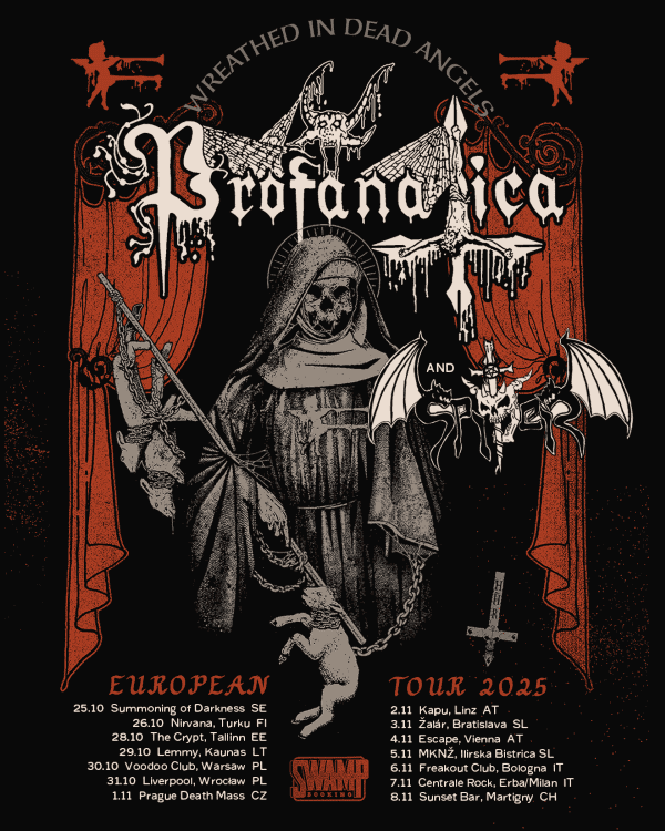 Σήμερα, οι θρυλικοί PROFANATICA ανακοινώνουν τον πρώτο γύρο ευρωπαϊκών ημερομηνιών. Μαζί τους θα εμφανιστούν οι SPITER, συνοδοιπόροι τους στη Hells Headbangers. Η περιοδεία θα εκτείνεται τόσο τον Οκτώβριο όσο και τον Νοέμβριο, με τον πρώτο γύρο να περιλαμβάνει 13 εμφανίσεις σε όλη την Ευρώπη. Οι επιβεβαιωμένες ημερομηνίες και οι χώροι για το πρώτο σκέλος της περιοδείας – καθώς και η αφίσα – έχουν ως εξής: