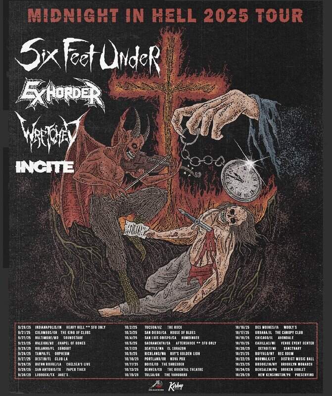 Οι SIX FEET UNDER επιστρέφουν δυναμικά στις σκηνές αυτό το Φθινόπωρο με νέα headline περιοδεία στις ΗΠΑ. Το “Midnight In Hell 2025 Tour” ξεκινά στις 20 Σεπτεμβρίου στην Ινδιανάπολη της Ιντιάνα και ολοκληρώνεται στις 25 Οκτωβρίου στο New Kensington της Πενσυλβάνια, με μια ειδική εμφάνιση στο φετινό Aftershock Festival. Υποστήριξη στην περιοδεία θα προσφέρουν οι EXHORDER, WRETCHED και INCITE.