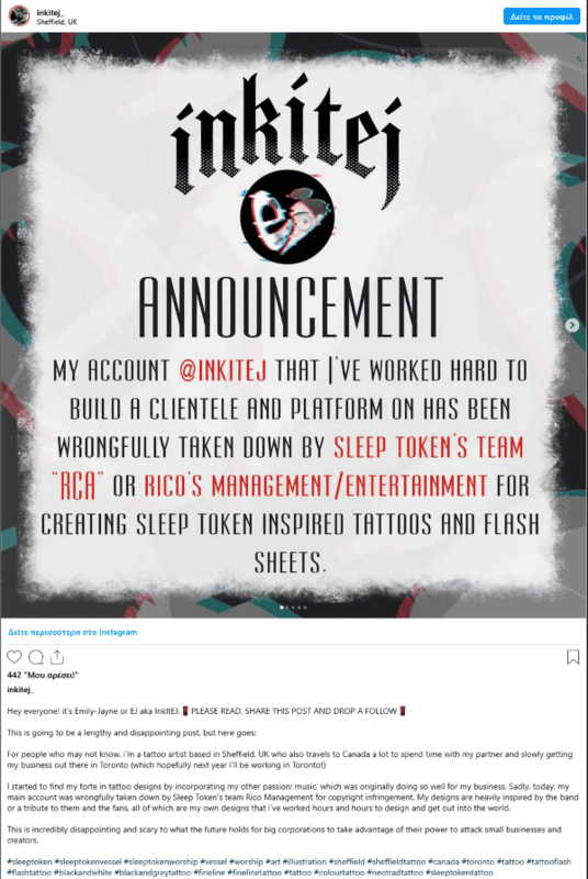 “Ο λογαριασμός μου @inkitej, πάνω στον οποίο δούλεψα σκληρά για να χτίσω πελατολόγιο και παρουσία, κατέβηκε άδικα από την ομάδα των SLEEP TOKEN, την RCA ή τη Rico Management/Entertainment, επειδή δημιούργησα σχέδια τατουάζ και flash sheets εμπνευσμένα από τους SLEEP TOKEN.