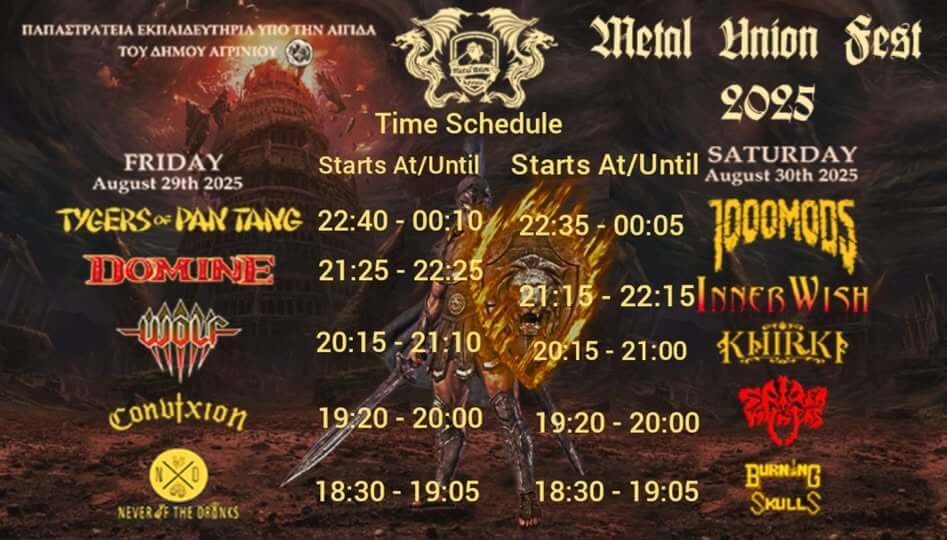 Πλησιάζουν οι ημέρες για τα τελευταία καλοκαιρινά φεστιβάλ του 2025 με ένα από αυτά να είναι το Metal Union Festival στην πόλη του Αγρινίου υπό την αιγίδα του Δήμου Αγρινίου. Το διήμερο METAL UNION FESTIVAL AGRINIO ανοίγει τις πύλες του στα Παπαστράτεια Εκπαιδευτήρια στο Αγρίνιο, Παρασκευή 29 και Σάββατο 30 Αυγούστου 2025 και σας καλεί να απολαύσετε εξαιρετικά συγκροτήματα από την Ελλάδα και το εξωτερικό.