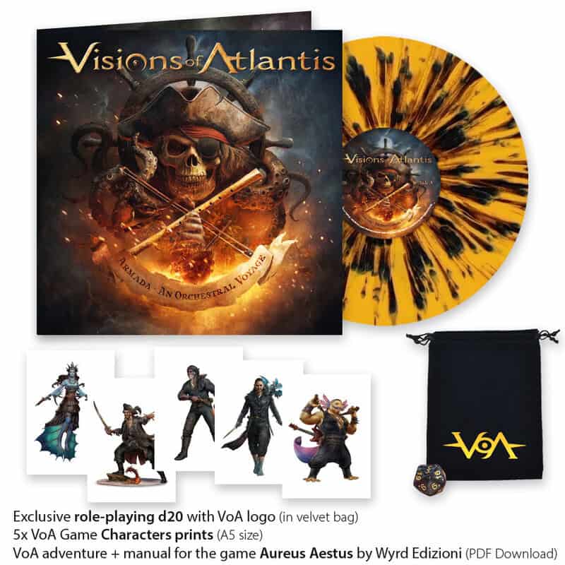Το Armada – An Orchestral Voyage θα είναι διαθέσιμο σε πολλές συναρπαστικές εκδόσεις, με πακέτα που περιλαμβάνουν ένα συναρπαστικό adventure game των VISIONS OF ATLANTIS, D20 ζάρια και οδηγό, σχεδιασμένο για το Aureus Aestus από την Wyrd Edizioni, καθώς και πανέμορφα A5 prints χαρακτήρων, σχεδιασμένα για το Aureus Aestus από τον Mirco Paganessi.