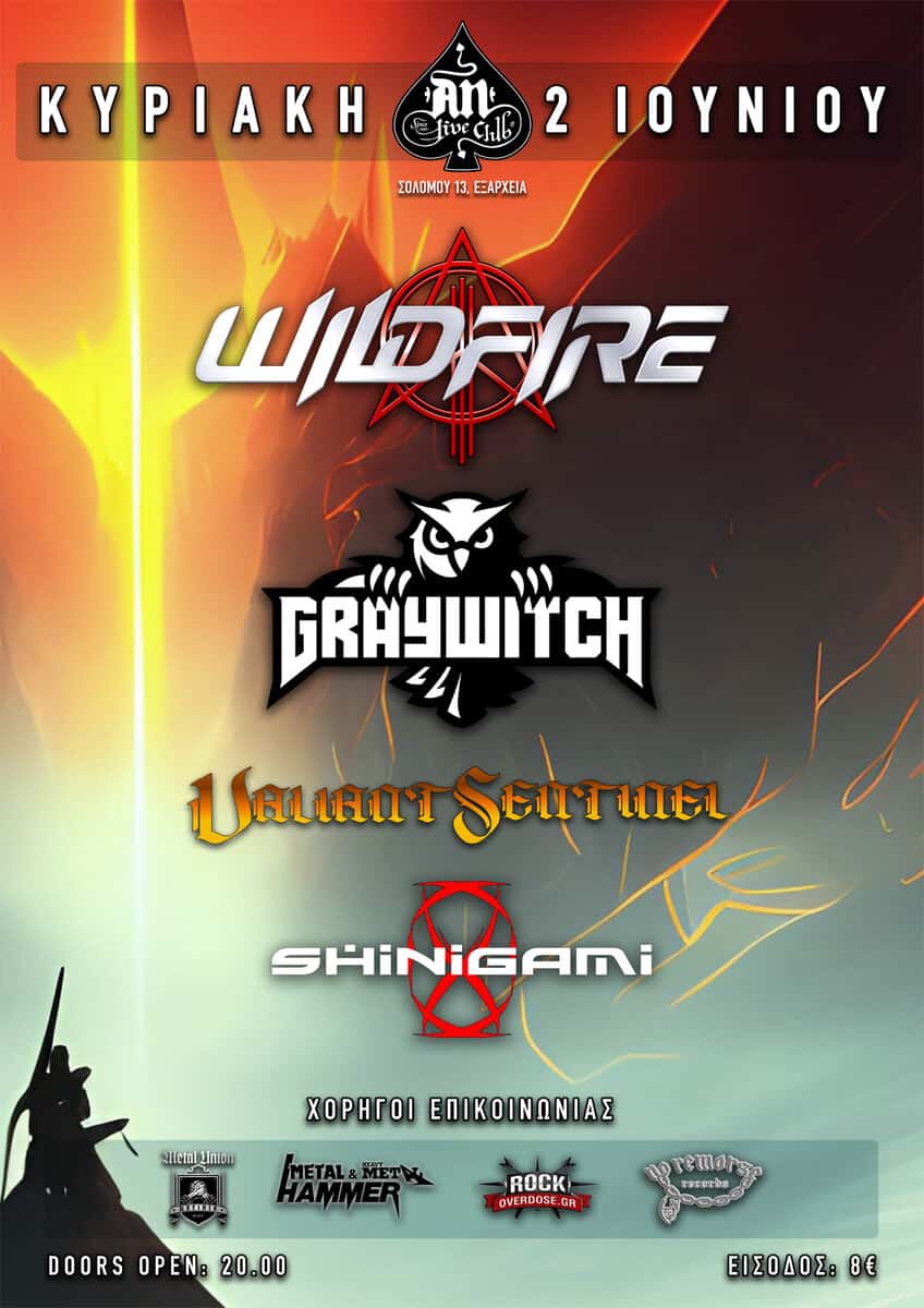 Την Κυριακή 2 Ιουνίου, το An Club θα φιλοξενήσει μια απίθανη βραδιά γεμάτη με heavy metal! SHINIGAMI, VALIANT SENTINEL, GRAYWITCH & WILDFIRE θα ενώσουν τις δυνάμεις τους για να διασκεδάσουν τους φανατικούς οπαδούς του heavy metal . Είστε έτοιμοι για ασταμάτητο headbanging??